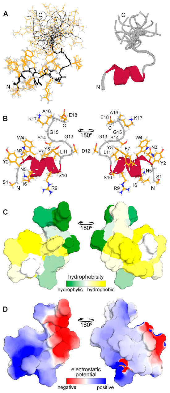 The spatial structure of monomeric CpRE12 (major form) was studied by standard NMR methods. According to the NMR structure calculation, the peptide has a relatively stable N-terminal part (residues 1–14) with a short α-helix represented by two turns (residues 3–11), while the C-terminal part is rather flexible (Figure 4). The molecular surface of the folded N-terminal part is amphiphilic with positively charged hydrophilic and large hydrophobic areas, the flexible C-terminal part is hydrophilic and has both positively and negatively charged residues. All resonance assignments and NMR-derived structures have been submitted to the Protein Data Bank (PDB identifier for the CpRE12 peptide is 8R89).