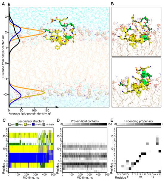 The experimentally observed conformational exchange and interaction with the membrane of CpRE12 were confirmed and clarified by MD-relaxation of the NMR-derived structure in the explicit POPC lipid bilayer (Figure 5). According to the MD simulation, the folded N-terminal helical part CpRE12 (Figure 5C and Figure S4A), having a distinct pattern of protein-lipid interface formed by hydrophobic and aromatic side chains of residues (Figure 5D), is submerged into the membrane surface under the phosphorous groups of lipids (Figure 5A). The flexible C-terminal part CpRE12 is exposed to water and undergoes conformational exchange with transient folding into a helical turn (residues 13–17) stabilized by local H-bonding in the region 12–15 and the formation of a salt-bridge between the side chains of R9 and E18 (Figure 5C and Figure S5B,C). In addition, a transient long-range H-bond formation is observed between S1 and E18, bringing the N- and C-termini of CpRE12 closer to each other.