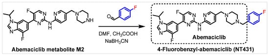 The starting material abemaciclib metabolite M2 (Cas No. 1231930-57-6) was obtained commercially (Muse Chem, Fairfield, NJ, USA). Abemaciclib (HY-16297A) was obtained from MedChemExpress (Monmouth Junction, NJ, USA). Solvents and other chemicals were obtained from MilliporeSigma (St. Louis, MO, USA) and were used as received. C18 light SPE cartridges were purchased from Waters (WAT023501, Milford, MA, USA).