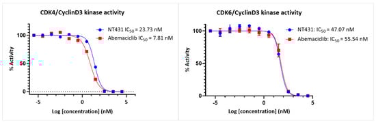 As shown in Figure 3, NT431 inhibited the CDK4/CyclinD3 and CDK6/CyclinD3 kinase activity with IC50 = 23.7 and 47.1 nM, respectively. The IC50 values for NT431 were comparable to that of the parent abemaciclib, which exhibited IC50 = 7.8 and 55.5 nM for CDK4/CyclinD3 and CDK6/CyclinD3, respectively.