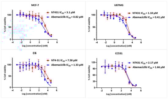 We performed MTT assays to determine the cytotoxic effects of NT431 in cultured cancer cell lines MCF-7 (breast cancer), U87 and C6 (glioblastoma), and CC531 (rat colon carcinoma). All four cell lines were plated and treated with increasing concentrations of NT431 or abemaciclib for 48 h. The cell viability was assessed as described in Section 4.