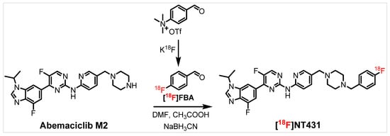 The radiosynthesis of [18F]NT431 was performed in a two-step one-pot reaction with subsequent addition of the reactants at the appropriate time interval without radiochemical separation as described below. First, the radiosynthesis of 4-[18F]fluorobenzaldehyde (4-[18F]FBA) (produced in 7 min) was performed as previously reported [23]. Briefly, the precursor 4-formyl-N,N,N-trimethylbenzenaminium triflate (4.0–5.0 mg) in DMF (0.4 mL) was added to the dried [18F]fluoride/kryptofix2.2.2 and reacted at 130 °C for 7.0 min. Second, the key precursor abemaciclib metabolite M2 (5.0 mg) dissolved in acetic acid/DMSO (50.0 µL each) was added to the 4-[18F]FBA mixture followed by the addition of sodium cyanoborohydride (NaBH4CN, 10 mg) in DMSO (100 µL). The reaction mixture was heated at 120 °C for 7 min. The production of [18F]NT431 by reductive amination was confirmed through analytical radio-HPLC. The acetic acid was removed under a stream of argon followed by addition of water (3.0 mL). Solid phase separation (SPE) was performed by trapping [18F]NT431 on a short C-18 cartridge (Waters) that was washed with 10% acetonitrile/ammonium acetate solution (10.0 mL) followed by washing with water twice (2 × 10.0 mL). The trapped [18F]NT431 was then eluted with acetonitrile (1.0 mL), and ammonium acetate solution (NH4OAc: 20 mM) (0.5 mL) was added. [18F]NT431 was purified using semipreparative radio-HPLC system with a 1260 series pump (Agilent Technologies, Stuttgart, Germany) with a built-in UV detector operated at 250 nm and a radioactivity detector with a single-channel analyzer (labLogic). [18F]NT431 was eluted from the C18 reverse-phase column (00G-4041-N0: Luna® 5 µm, 100 Å, 250 × 10 mm, Phenomenex) using 65% acetonitrile: 35% ammonium acetate buffer (NH4OAc: 20 mM) at flow rate of 4.0 mL/min. [18F]NT431 was collected at ~21.0 min post injection (Figure S3). Water (15.0 mL) was added to the collected solution, and the [18F]NT431 was trapped on a C18 light cartridge and eluted with ethanol (0.3 mL) and formulated for in vivo and in vitro studies. [18F]NT431 was formulated by the addition of a solution that contains 15% ethanol and 85% sodium ascorbate in water (5 mg/mL).