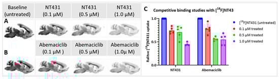 We performed in vitro autoradiography with [18F]NT431 in rat brain tissues using phosphor imaging as shown in Figure 6. In vitro autoradiography with [18F]NT431 was utilized at baseline and after competitive blocking to further confirm the specific binding of [18F]NT431 to CDK4/6 in the brain. This was established via competitive blocking with NT431 (self-blocking) or blocking with the parent FDA-approved abemaciclib at 1.0, 0.5, and 0.1 µM concentrations. The data in Figure 6C demonstrates a dose-dependent displacement of the [18F]NT431, thus indicating that the uptake of [18F]NT431 in the brain tissues was displaceable and specific to CDK4/6. These in vitro displacement studies with NT431 and abemaciclib were further confirmed by PET imaging in vivo as shown in Figure 6 below. It is also likely that higher concentrations (i.e., 5–10 µM) of the non-radioactive inhibitor will be needed to further delineate the specific binding and provide information about the non-specific binding.