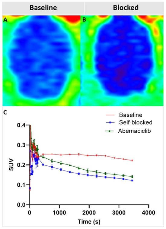 The specific uptake of [18F]NT431 in the brain was confirmed in vivo through competitive blocking with the corresponding non-radioactive NT431 which led to a significant reduction in the radioactive signal time activity curve compared to the baseline (Figure 7B,C). Moreover, the data in Figure 7 demonstrates for the first time that abemaciclib can cross the BBB and enter the healthy brain, albeit with relatively low brain uptake. The specific binding of abemaciclib (excess) to CDK4/6 in the brain resulted in a significant reduction in the tracer time activity curve due to competitive binding to CDK4/6 by reducing the available binding sites for the radiotracer [18F]NT431.