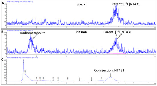 To obtain protein-free plasma, the collected blood samples were centrifuged (Eppendorf 5702) at 4000 rpm for 5 min. Acetonitrile (2.0 mL) was then added, and the mixture was centrifuged (Eppendorf 5453) at 12,000 rpm for 3 min. The supernatant was collected, and the radioactivity was measured by using a gamma counter. The recovery was ~42%. The solution was passed through a 0.22 µm filter, and a sample (200 µL) from the resulting filtrates was injected into the analytical HPLC for analysis. The extent of radiometabolism of [18F]NT431 in the brain and the blood was determined by integrating the radioactive peaks compared to the parent [18F]NT431 (Figure 8).