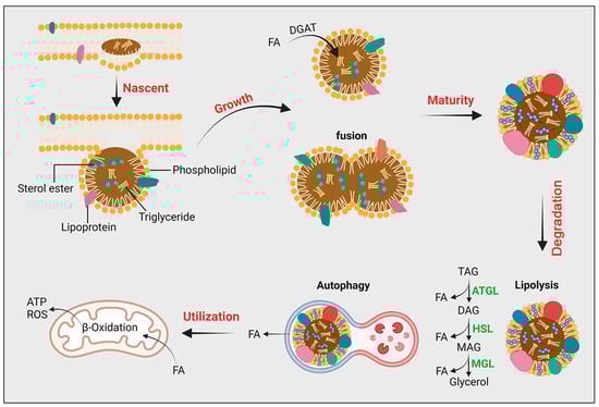 LD growth can occur through several mechanisms: de novo synthesis of lipids, uptake of external lipids, and fusion of existing LDs. Lipid transport proteins, such as fatty acid-binding proteins, and lipases contribute to these processes, regulating the size and lipid composition of LDs. Maintenance of LD integrity is also crucial. Proteins associated with LDs, including members of the perilipin family, orchestrate these dynamics, mediating interactions with lipases and other regulatory proteins [].