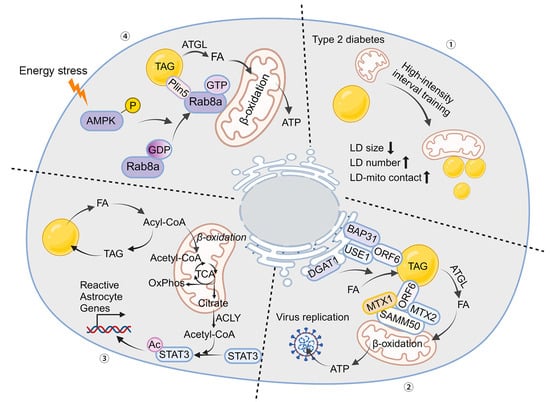 Role of LD–Mitochondria Interaction in Diverse Diseases. (1) Type 2 diabetes: Excessive storage of lipid droplets (LDs) in skeletal muscle is a hallmark of type 2 diabetes. High-intensity interval training (HIIT) exercise alters the size, subcellular distribution, and mitochondrial content of LDs, improving the deficiency of intramuscular LDs. (2) Viral replication: The ORF6 protein inserts into the LD lipid monolayer through its two amphipathic helices. It interacts with endoplasmic reticulum (ER) membrane proteins BAP31 and USE1 to mediate the formation of ER–LD contacts. Additionally, ORF6 connects mitochondria to LDs by interacting with the SAM complex in the mitochondrial outer membrane, promoting cellular lipolysis and LD biogenesis, reprogramming lipid fluxes, and facilitating viral replication. (3) Astrocyte reactivity: When fatty acid load exceeds the oxidative phosphorylation (OxPhos) capacity of astrocytes, elevated acetyl-CoA levels induce astrocyte reactivity by enhancing STAT3 acetylation and activation. (4) Fatty acid utilization in skeletal muscle: In rat skeletal muscle cells, the energy sensor AMPK increases the GTP-binding activity of Rab8a, facilitating LD–mitochondria interactions by binding to PLIN5 under starvation conditions. The assembly of the Rab8a-PLIN5 tethering complex recruits ATGL, mobilizing and transferring long-chain fatty acids (LCFAs) from LDs to mitochondria for β-oxidation. Rab8a deficiency in a mouse model impairs fatty acid utilization and reduces exercise endurance. The arrows mean decrease or increase.