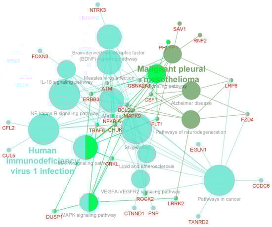 | Malignant pleural mesothelioma | 9.83 × 10−3 | 1.79 | 8 | ATM, CSF1, CSNK2A1, FLT1, LRP6, MAPK9, RNF2, SAV1 |