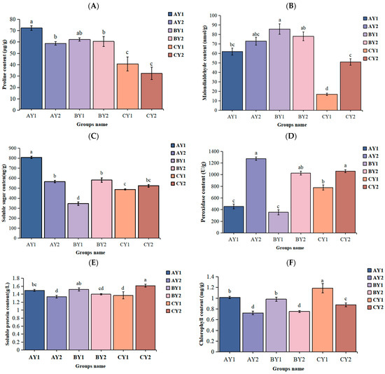 Physiological changes in quinoa seedlings under different stresses: (A) proline content, (B) malondialdehyde content, (C) soluble sugar content, (D) peroxidase content, (E) soluble protein content, and (F) total chlorophyll content. Identical letters (a–d) indicate no significant differences (p > 0.05), and groups with different letters indicate significant differences (p < 0.05).