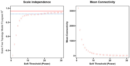 Scale-free fitting indices for soft threshold power and average connectivity. X-axis in both plots represents the weight parameter β. Y-axis in the left plot represents the correspondence between β and the goodness-of-fit (R2) for neighbor-joining matrices after transforming the scale-free network assumptions. The red line is the standard line for optimal threshold (β-value) selection; the blue line is the reference line when the β-value is not reached. R2 > 0. 8 when the soft threshold value is 22. Y-axis in the right plot represents the average neighbor-joining functions of all genes among the corresponding gene modules, as determined by the representation of the corresponding β-value-transformed neighbor-joining matrices.