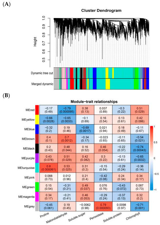 A dynamic hybrid cropping method was used to divide the co-expression modules. After merging the small modules with high similarity, we obtained 11 modules (Figure 3A), each corresponding to a color, with the highest number of genes in the turquoise module (3856), followed by the gray module (1005). Physiological traits were then correlated with the gene modules (Figure 3B). The turquoise module had the most significant positive correlation with proline (r = 0.8, p = 0.000061), the gray module had a positive correlation with peroxidase (r = 0.79, p = 0.000093) and chlorophyll (r = −0.71, p = 0.001), and the red module was negatively correlated with malondialdehyde (r = −0.79, p = 0.000095).