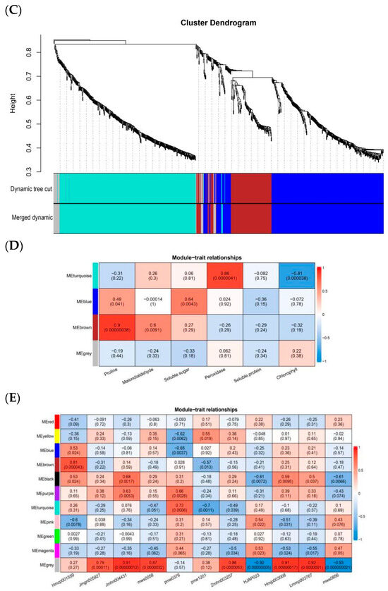 Weighted Gene Co-Expression Network Analysis diagram. (A) Gene Cluster Tree. (B) Heatmap of gene module correlations with physiological traits. (C) Metabolite Cluster Tree. (D) Heatmap of metabolite module correlations with physiological correlations. (E) Heatmap of gene module correlations with metabolites. The y-axis shows the module name, with each row representing a module, and the x-axis shows the trait name, with each column representing a trait. The numbers in the rectangular boxes indicate the correlation coefficients and corresponding p-values between physiological traits and modules. The strength and direction of the correlations are shown on the right side of the heat map (where blue indicates negative correlations, and red indicates positive correlations).