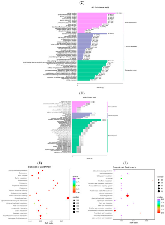 To explore the functional classification and metabolic pathways of low-temperature stress-responsive genes, Gene Ontology (GO) and Kyoto Encyclopedia of Genes and Genomes (KEGG) were performed on the turquoise and gray modules, respectively (Figure 4). GO pathways can be categorized into biological process (BP), molecular function (MF), and cellular component (CC) pathways. The turquoise module was enriched in the 372 CC, 2177 BP, and 742 MF pathways, but it was predominantly enriched in mRNA binding (GO: 0003729), spliceosome complex (GO: 0005681), and U12-type spliceosome complex (GO: 0005689) (Figure 4C). The gray module was enriched in 764 BP, 145 CC, and 315 MF pathways, but predominantly metal cluster binding (GO: 0051540), iron–sulfur cluster binding (GO: 0051536), ribosomal subunits (GO: 0044391), precursor metabolite production and energy (GO: 0006091), and photosynthesis (GO: 0015979). The GO enrichment analysis showed that the growth and development of quinoa seedlings under low-temperature stress were predominantly affected by influencing enzymatic reactions and metabolic processes (Figure 4D).