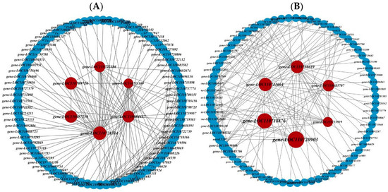 Gene network interaction map. Candidate hub genes for Meturquoise (A) and Megray (B) from the network analysis of interactions with known core genes. The red color represents the genes screened for the core genes, each node in the network represents a gene, and the edges represent the relationships between the genes.