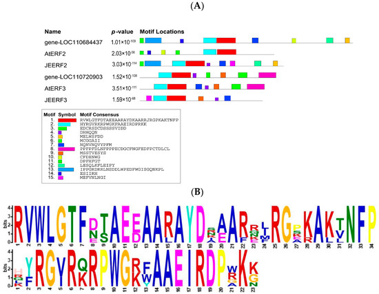 Comparative analysis of AP2/ERF family genes. (A) Conserved motif analysis; AtERF is a transcription factor family of Arabidopsis, and JEERF is a transcription factor family of tomato. (B) Conserved motif sequence tags.