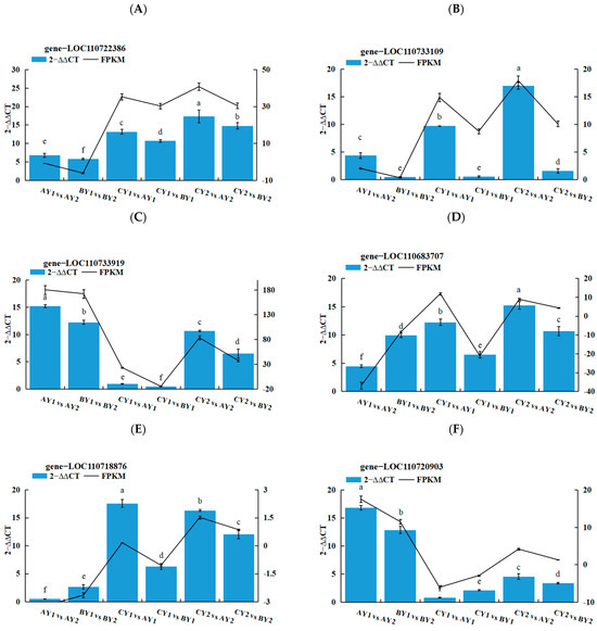 (A–F) Validation of gene expression levels of randomly selected core genes by RT-qPCR. Identical letters (a–f) indicate no significant differences (p > 0.05), and groups with different letters indicate significant differences (p < 0.05).