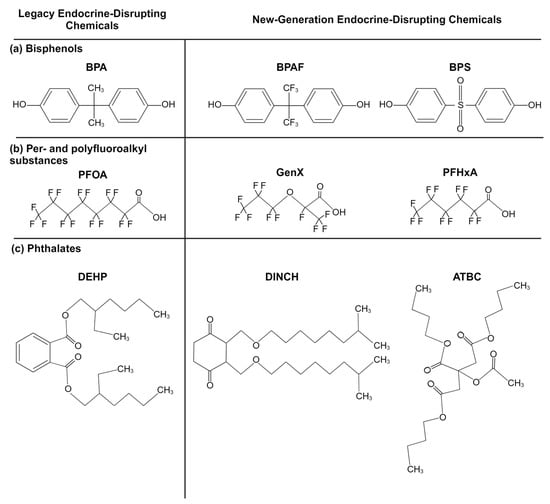 Example chemical structures of (a) bisphenol, (b) per- and polyfluoroalkyl substance, and (c) phthalate legacy and new-generation endocrine disruptors (created with BioRender.com (accessed on 20 June 2024)).