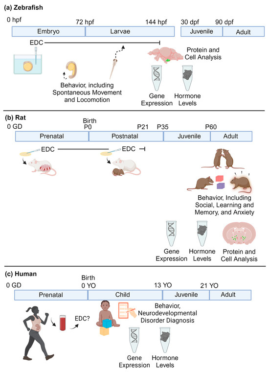 (a) Zebrafish, (b) rat, and (c) human models of neurodevelopmental exposure to EDCs. In a and b, EDC exposures are controlled and typically given through prenatal and/or postnatal exposure. In rats, this typically ends at or before weaning at P21. Note that the procedures in mice and rats are similar. In humans, exposures will vary across individual subjects. hpf = hours post-fertilization; dpf = days post-fertilization; GD = gestational days; P = postnatal days; YO = years old (created with BioRender.com (accessed on 5 April 2024)).