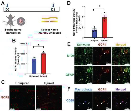 GCPII enzymatic activity and expression increased following peripheral nerve injury. (A) Experimental design schematic: 3-month-old mice underwent left sciatic nerve transection, and 3 days later, both the transected nerve and the contralateral uninjured nerve were collected for enzymatic activity and expression analysis. (B) GCPII enzymatic activity was significantly higher in the injured nerve compared to the uninjured contralateral nerve (10,047 ± 440 vs. 7464 ± 626 fmol/mg/h; p < 0.05, n = 3). (C) GCPII immunofluorescent staining in the injured nerve was more abundant than in the uninjured nerve. Scale bar in images indicates 100 μm (D) GCPII expression was quantified by calculating the integrated immunofluorescent density divided by the nerve area, analyzed using Image J 2.14.0 (1.50 ± 0.27 vs. 3.88 ± 0.48 arbitrary units/pixel2; p < 0.05, n = 3). (E) GCPII (red) was co-localized with Schwann cell markers S100 and GFAP (green) in the injured nerve (arrows indicating colocalization). Scale bar in images indicates 15 μm. (F) GCPII (red) was colocalized with the macrophage marker CD68 (blue) in the injured nerve (arrows indicating colocalization). Scale bar in images indicates 15 μm. Statistics were performed using unpaired Student’s t-tests. Bars represent mean ± SEM. * p < 0.05, n = 3.