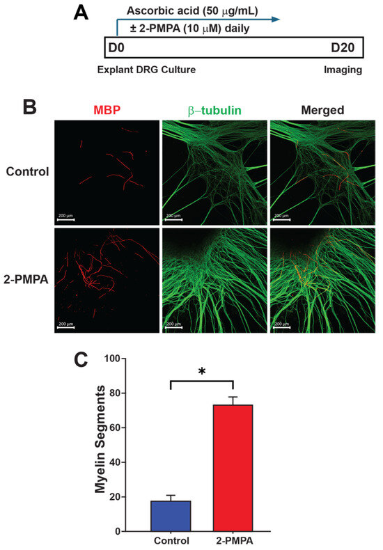 DRG explant culture was performed with modifications from previously published methods [57,58,59]. C57BL/6 male mice were obtained from Jackson Laboratory. DRGs were dissected on postnatal days 4–5 (P4–P5) [54], then cultured in a Neurobasal medium supplemented with 2% B27. Ascorbic acid at a concentration of 50 μg/mL was added daily to stimulate myelination by enhancing the synthesis of extracellular matrix and basal lamina assembly in Schwann cells. In the experimental conditions, vehicle or 10 μM 2-PMPA was added to the media daily. Each condition contained eight or more DRG explants. The DRG explants were examined at 5 and 10 days under fluorescent microscopy to visualize axonal outgrowth and remyelination. Samples were stained with β-tubulin and MBP to highlight neurofilament and MBP, respectively. The myelination of axons was quantified by counting individual myelin segments along axons, defined by their MBP. The total number of newly myelinated segments for each explant was recorded. All DRG culture imaging was performed with a Zeiss confocal microscopy (LSM800, White Plains, NY, USA) using Zen software 3.10.