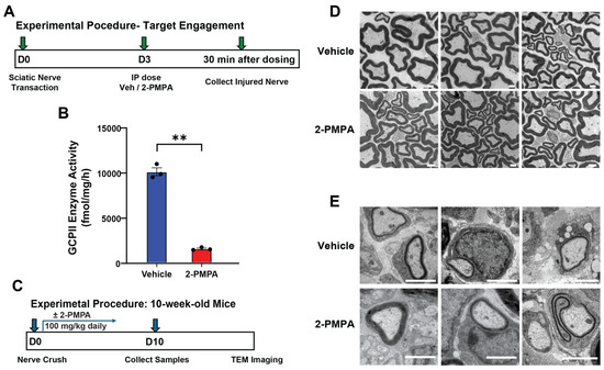 Given these promising in vitro data, we proceeded to in vivo studies to further investigate the effects of GCPII inhibition on remyelination. We chose to initially test 2-PMPA at a daily intraperitoneal (IP) dose of 100 mg/kg based on previous pharmacokinetics studies [39]. To confirm target engagement using this dose in our PNI model, we measured GCPII activity in the peripheral nerve 30 min following a 100 mg/kg IP dose (Figure 3A,B). The 2-PMPA significantly attenuated the injury-induced elevation of GCPII activity (10,047 ± 440 vs. 1504 ± 89 fmol/mg/h; p < 0.01), demonstrating robust target engagement.