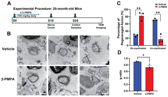 GCPII inhibition enhances remyelination in aged mice following PNI. (A) Experimental design schematic: 20-month-old mice were treated with vehicle or 2-PMPA for 15 days, and then underwent sciatic nerve crush injury. Treatment with vehicle or 2-PMPA continued for an additional 10 days before mice were sacrificed and their nerves collected for TEM. (B) Representative TEM images of crushed axon structures from mice treated with vehicle or 2-PMPA showing that 2-PMPA treatment enhanced remyelination in aged mice after crush injury. Scale bar in images indicates 1 μm. (C) The 2-PMPA-treated group showed 82.5 ± 7.2% remyelination, while the vehicle-treated group showed 28.1 ± 2.1% remyelination (21–27 axons with a diameter above 1 μm were analyzed per nerve; p < 0.01, n = 3). (D) The 2-PMPA-treated group showed a g-ratio of 0.73 ± 0.05, while the vehicle-treated group showed a g-ratio of 0.90 ± 0.01 (p < 0.05). Statistics were performed using unpaired Student’s t-tests. Bars represent mean ± SEM. * p < 0.05, ** p < 0.01, n = 3.