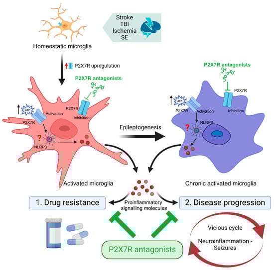 - Gil, B.; Smith, J.; Tang, Y.; Illes, P.; Engel, T. Beyond Seizure Control: Treating Comorbidities in Epilepsy via Targeting of the P2X7 Receptor. Int. J. Mol. Sci. 2022, 23, 2380. [Google Scholar] [CrossRef] [PubMed]