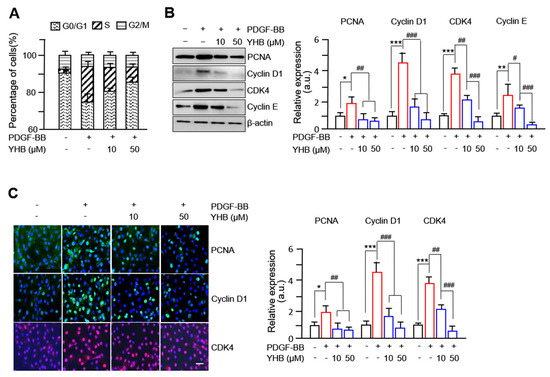 2.2. YHB Suppresses PDGF-BB-Induced Expression of Cell Cycle Regulatory Proteins in VSMCs