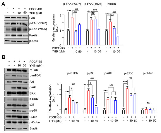 2.4. YHB Modulates FAK-Related and mTOR/p38 Signaling Pathway in PDGF-BB-Stimulated VSMCs