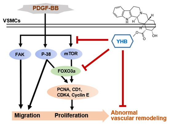 Lim L, Kim H, Jeong J, Han SH, Yu Y-B, Song H. Yohimbine Inhibits PDGF-Induced Vascular Smooth Muscle Cell Proliferation and Migration via FOXO3a Factor. International Journal of Molecular Sciences. 2024; 25(13):6899. https://doi.org/10.3390/ijms25136899