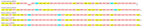 A map of the mitochondrial genomes of five mussel species: Arcuatula senhousia (two sequences), Mytilus coruscus (two sequences), and Mytilus californianus (one sequence), which serves as a brief sample representation of the Mytilidae taxa. More details on mitogenome diversity are given in Figures S1 and S2 in the Supplementary Materials. The composition for the chains of the mitogenomes is given in abbreviated form and in color. The mitogenomes include: 12 protein-coding genes (abbreviated on the map as follows: atp6, cox1, cox2, cox3, cytb, nad1, nad2, nad3, nad4, nad4L, nad5, and nad6; shown by the yellow color), 2 rRNA genes: rrnS, rrnL (abbreviated as 12S rRNA and 16S rRNA; shown by the blue color), and 22 tRNA genes that are abbreviated as coding for specific amino acids: T-Trp, C-Cys, E-Glu, Y-Tyr, R-Arg, G-Gly, H-His, L1-Leu1, L2-Leu2, S1-Ser1, S2-Ser2, Q-Glu, F-Phe, M-Met, V-Val, A-Ala, D-Asp, N-Asn, P-Pro, I-Ile, K-Lys, and W-Trp (all are shown by the red color). The genes in the majority are located on the “+“ strand; the genes shown as shifted into a separate line indicate their location on the “−” strand.