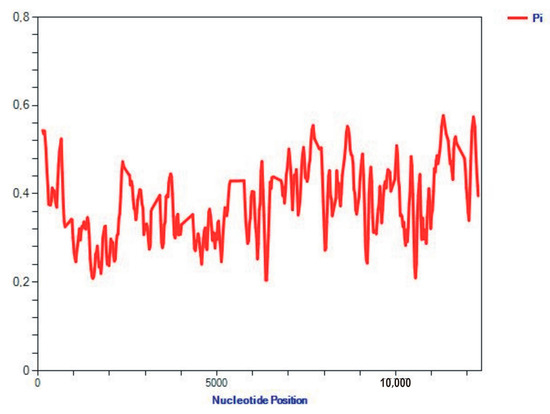 The majority of the protein-coding genes of mussels use the ATG start codon, but the ATA and ATT are common as start codons as well. For example, the ATG start codon appears in 19 out of 36 (or 52.8%) PCGs of the three species exemplified in Table 1. A typical three-nucleotide stop codon, the TAA, appears in 28 out of 36 (or 77.8%) PCGs, while atypical or incomplete TAG/T stop codons represent the rest, at around 22% (Table 1). The control region (CR; D-loop) is 653 bp long in A. senhousia and 60 bp long in M. coruscus, but it is undetected in M. californianus (Table 1). Our analysis of the sequences showed a very high variability and the informative capacity of the 12–13 PCGs among the investigated members of the mussel family, Mytilidae. The nucleotide diversity per site, Pi (π, Pi for simplicity herein and after), along the sites of the sequences of the 12 PCGs varies widely, as evidenced by the plot built using the software package (SP) DNAsp-6 (Figure 2). The nucleotide diversity, Pi, is the most representative measure of gene variability [35] (equation 10.5) and will be used in many comparisons in this paper.
