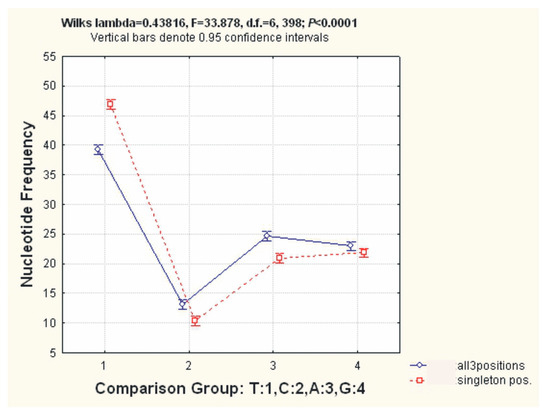 The differences in nucleotide frequencies for the three codon positions and for only the singleton positions for 12 PCGs among 26 sequences were visualized after performing a MANOVA using SP Statistica 6 (Figure 3). The heterogeneity of the nucleotide frequencies between the four types of nucleotides was statistically significant for the set of 26 mitogenomes in the two data sets presented: Wilk’s Lambda = 0.43816, F = 33.878, d.f. = 6, p < 0.0001.