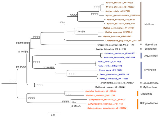 The combined phylogram built using NJ, MP, ML, and BI techniques, and the analyses performed in SP MEGA-11 for NJ, MP, and ML, and in SP MrBayes for BI. The tree reconstruction was based on 12 PCG sequences of 26 mussel representatives of the Mytilidae family. For NJ, MP, and ML trees, support for the topology scores was obtained by a bootstrap test with 1000 replications. The BI inference support for the nodes is defined by the posterior probabilities, estimated with 105 generations. The support scores are shown besides the nodes only for interspecies and higher-rank clades. The NJ tree is basic, for representation of the four topologies. The tree here and trees in Figure 5 and Figure 6 are rooted with the Modiolus-Bathymodiolus branch. The scale below the phylogram shows the branch length in distance units. All the scores of the supports for the nodes are given as probabilities, both for bootstrap frequencies and for BI. All the intraspecies support scores are close to 1. For convenience, they are omitted in this and the following phylograms (Figure 5 and Figure 6). The scores of supports are given in this order: NJ/MP/ML/BI. Scores of less than 0.50 are denoted with a dash. The best-fit model, GTR + I + G, was implemented where appropriate. Subfamily divisions, shown on the right, follow the WoRMS resource system (https://www.marinespecies.org/aphia.php?p=taxdetails&id=211; accessed on 2 April 2024).