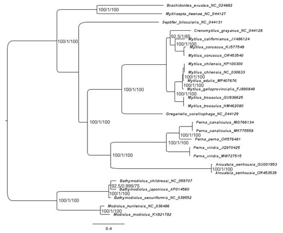 Figure 5 shows a gene tree built with three techniques, using the combined sequences of 12 PCGs of 26 mitogenomes. The topology is clearly resolved for all branches except the branch for Arcuatula + Perna and the complex branch, Gregariella + Cremomytilus + Mytilus, where the support scores are equal to 45.2% for the SH-aLRT branch test, 58% for the ML test, and 0.99 for BI inference (Figure 5).