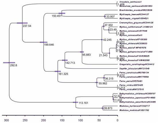 The dating of divergence times was made with calibration points based on the paleontological records. The most recent common ancestors (MRCA) comprise the reference points for the calibration of molecular divergence. The calibration points for the molecular divergence are 292.8 million years ago (Mya) for Modiolinae (Table 1, [89]) and 244.6 Mya for Mytilus [90] (Mytilus nativus, dated 247.2–242 Mya. The definition of the second calibration point in the International Chronostratigraphic Timescale is taken from https://paleobiodb.org/classic/displayTimescale?interval=139; accessed on 19 April 2024). Correspondingly, the first calibration point was applied to Mytilidae from the above taxa in the data matrix. Below, in the third paragraph after this one, more details can be obtained on this point.