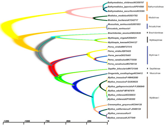 Phylogenetic lineages reconstructed via BEAST-2 and visualized with the DensyTree v.2.2.7 software, based on 27 sequences of 12 PCGs of the Mytilidae family. Simulated lineages are naturally rooted in five presumed ancestral taxa, including the predefined outgroup taxon Modiolus. Wider lines depict the consensus trees constructed by computer simulations of the coalescent process of molecular evolution in constant populations during 5 × 107 generations by BEAST-2. Thin lines show all possible trees that occurred during the time span, as depicted in the bottom scale given in the internal calibration provided by DensyTree. DensyTree reconstructed the time-tree interrelationships based on the same BEAST run and the same output tree file as that used for building Figure 7. The source tree file is available for use in Table S2 of the Supplementary Materials (File: Mytilidae27sq-no_pat-pt123ps.xml). The main branches are stained with different colors that depict some differences in the branching patterns.