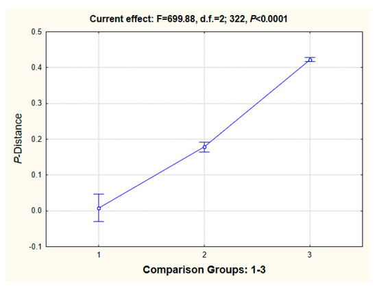 The results for all pairwise comparisons of the p-distances of 12 PCGS among 26 mitogenomes, i.e., for approach (ii), are: (1) 0.81 ± 1.94%; (2) 17.83 ± 0.71%; (3) 42.24 ± 0.29%. The ANOVA’s current effect is: F = 699.88, d.f. = 2; 322, p < 0.0001 (Figure 9). Because of the deviation from normal distribution, nonparametric testing for this approach was performed with the results for the (i) Kruskal–Wallis (K–W) and median (ii) tests: (i) H = 126.35, d.f. = 2, n = 325, p < 0.001; (ii) X2= 59.39, d.f. = 2, p < 0.0001.