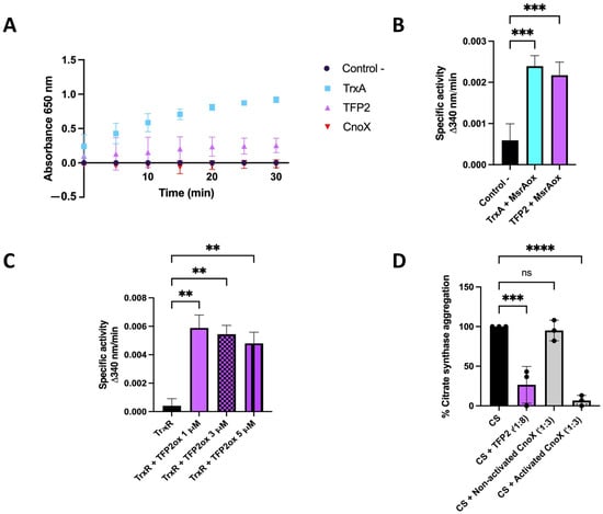 Muñoz-Villagrán, C.; Acevedo-Arbunic, J.; Härtig, E.; Sievers, S.; Zühlke, D.; Issotta, F.; Mascayano, C.; Jahn, D.; Jahn, M.; Levicán, G. The Thioredoxin Fold Protein (TFP2) from Extreme Acidophilic Leptospirillum sp. CF-1 Is a Chaperedoxin-like Protein That Prevents the Aggregation of Proteins under Oxidative Stress. Int. J. Mol. Sci. 2024, 25, 6905. https://doi.org/10.3390/ijms25136905