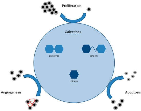 An increased expression of galectins is described in several tumor types, suggesting a functional role of galectins in tumor growth and progression by affecting angiogenesis, invasion, metastasis, apoptosis, and also immune escape (see Figure 1). Depending on the type of cancer, they can have tumor-suppressive or tumor-activating effects [18]. Therefore, galectin expression is frequently usable as a prognostic marker for cancer patients‘ survival [19,20,21].