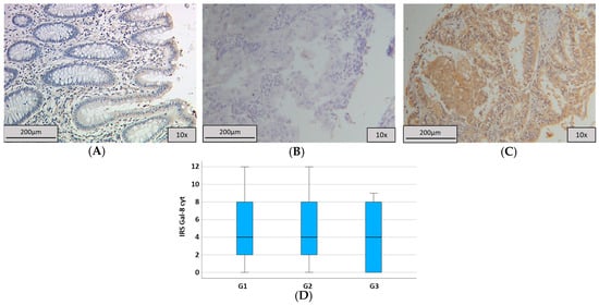 Galectin-8 staining. (A) Positive control of Galectin-8 staining in colon tissue with strong cytoplasmic expression in epithelial cells. (B) Low cytosolic Gal-8 expression with IRS = 2. (C) High cytosolic Gal-8 expression with IRS = 12. (D) Boxplot regarding grading and Gal-8 expression with a median of 4 in all subgroups.