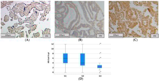 To control the quality of the Gal-9 staining, we used normal placenta tissue, which is cytoplasmatic, but no nuclear expression could be found in >90% of the trophoblastic cells (Figure 3A).