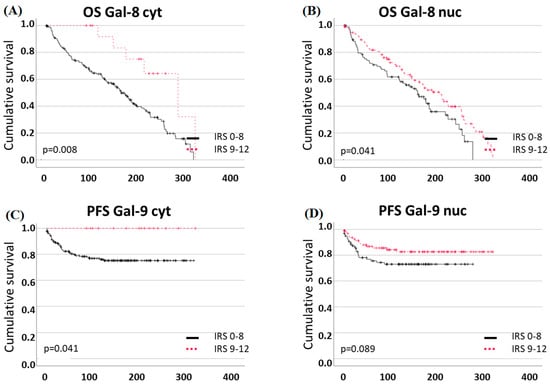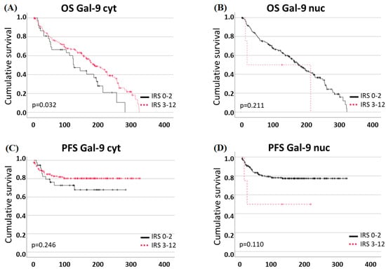 Higher Gal-9 expression in the cytosol (IRS ≥ 3) was associated with a positive correlation to OS (p = 0.032, Figure 5A, median OS Gal-9 low: 120, Gal-9 high: 181 months). For nuclear Gal-9 expression and OS, as well as Gal-9 expression and PFS, no statistically significant correlation could be found (Figure 5B–D).
