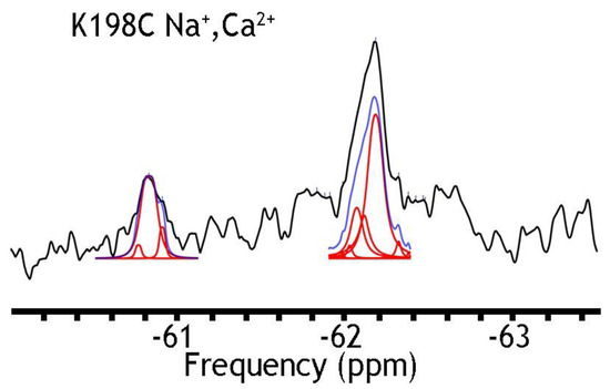19F spectra of nanodisc-reconstituted K198C in the presence of Na+ and Ca2+ ions. The purified preparation of K198C was labeled with BTFMA and then incorporated into nanodiscs as described in Section 4. The 19F-NMR spectra were recorded in the presence of 50 mM Na+ and 1 mM Ca2+. Spectrum recorded is shown in black, Lorentzian deconvoluted peaks in red, and the sum of fits in blue.