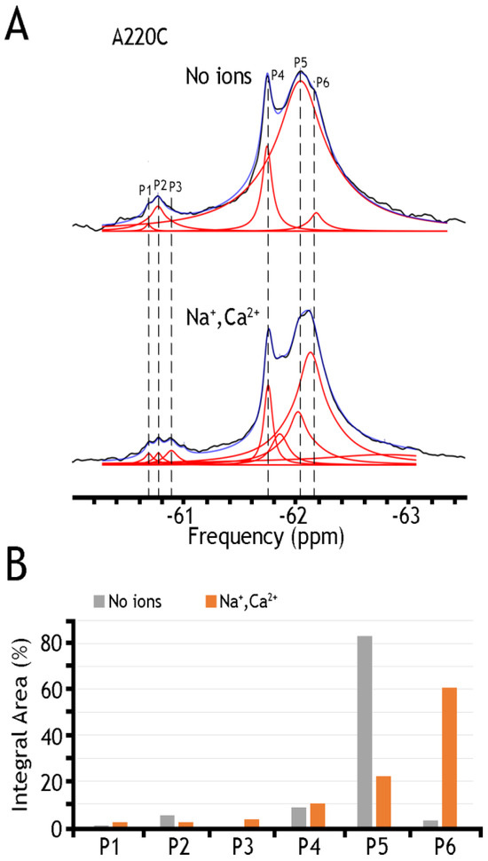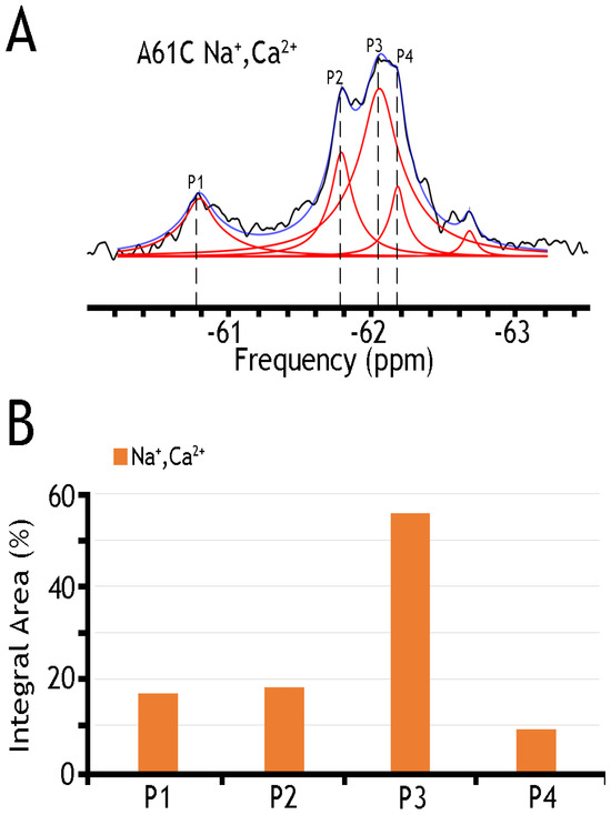 19F spectra of nanodisc-reconstituted A61C mutant. The purified preparation of A61C was labeled with BTFMA and then incorporated into nanodiscs (see Section 4). (A) 19F spectra of BTFMA-labeled A61 mutant (incorporated into nanodiscs) were recorded in the presence of Na+ and Ca2+ ions. Spectrum recorded is shown in black, Lorentzian deconvoluted peaks in red, and the sum of fits in blue. (B) The sub-state populations are quantified by comparing relative integral areas, where the designated sub-states (Ps) are marked on the 19F spectrum.