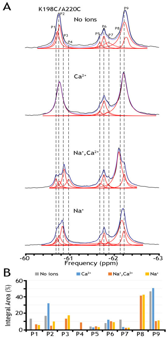 To further assess this hypothesis, we have run 19F-NMR experiments for the K198C/A220C double mutant, with a better view of the presumably IF state, in the absence of ions or the presence of Na+, Ca2+, or both ions (Figure 6). In the presence of both ions, we have detected at least five peaks in cluster 1 and as a minimum four peaks in cluster 2. The present observations indicate that P9 (presumably representing an overpopulated OF sub-state without the ion) can be converted into the P8 state upon Na+ addition. Similarly, P2, presumably representing the IF sub-state (which is more populated in the apo state), is converted to P3 in the presence of Na+. The overall changes in the population of the whole cluster 1 are quite modest again: from ~70.1% (in the absence of ions) to ~68.0% in the presence of Ca2+, to ~67.4% in the presence of Na+, and to ~67.3% in the presence of both ions. The present observations support the notion that Na+-induced changes in the populations of the conformers within either the OF or IF sub-states are more significant than the population changes that we observe between the “global” OF and IF states, therefore supporting the proposed working hypothesis. Even though the present 19F-NMR data cannot resolve structure–dynamic transitions underlying the ion-induced conformational changes, the present experimental setup can serve as a good basis for future experimental design and computational modeling, which in turn can provide valuable information on functionally relevant dynamic transitions between distinct sub-states within the OF or IF state. Moreover, the present analysis strongly supports the notion that the site-directed 19F probing of NCX_Mj may detect water accessibility changes at opposite entries of the ion-binding pocket, which could be very instrumental for identifying and characterizing functionally relevant sub-state populations limiting the ion transport rates and the intrinsic asymmetry of bidirectional ion binding/transport.