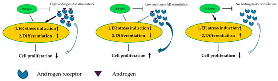 Diagram of the suspected role of PURα in prostate cancer cells. At a high androgen concentration, androgen/androgen receptor (AR) stimulates endoplasmic reticulum stress and cell differentiation but reduced cell proliferation in prostate cancer cells. At a low androgen stimulation, androgen/AR induces cell proliferation in prostate cancer cells. Without androgen, PURα induces endoplasmic reticulum stress and cell differentiation, resulting in a reduction in prostate cancer cell proliferation. On the other hand, AR may be negatively regulated by PURα but its involvement might be relatively low [46,47].