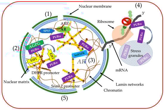 PURα in nuclear compartments binds single-strand (ss) DNA and ssRNA equally in a similar way. These in vitro results implicate that competition between DNA and RNA could be an important feature for the PURα-dependent regulation of gene expression in cells [42]. The molecular and cellular functions of PURα in neuronal disorders are well-summarized in Molitor et al. [42].
