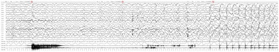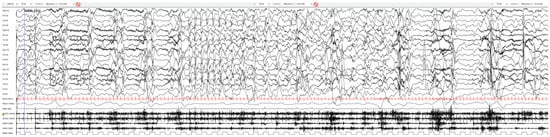 Herein, we report on a young girl evaluated for the first time at three years of age at the Neurological Department of Bambino Gesù Children’s Hospital in Rome, Italy, showing a severe epileptic encephalopathy. She is the only child of an unrelated, healthy couple. She was born at 39 weeks of gestation by spontaneous delivery after an uneventful pregnancy. Her weight at birth was 3.030 g (25° centile), her length was 51 cm (50° centile), and her occipital–frontal circumference was 33 cm (10th–25th percentile). Her Apgar score was 8 and 9 at the first and fifth minutes of birth, respectively. The perinatal period was reported as normal. The girl’s first seizure occurred at three months of age. The patient was admitted to the hospital because of poor visual engagement, delayed head control, and episodes of predominantly leftward eye deviation lasting roughly one minute, associated with poor responsiveness, resolving spontaneously. Upon admission, a delay in motor and developmental milestones was noted as she was not able to control her head or fixate her gaze. The results of brain MRI with contrast medium showed no anomalies. Her metabolic screening results, including pterines on the spot, dihydrobiopterin reductase (DHPR) activity, aminoacidic profile, and biogenic amines in cerebrospinal fluid, were found to be normal. The results of her wake and sleep electroencephalogram (EEG) showed polymorphic and asymmetric theta activity due to the presence of higher voltage activity in the posterior regions of the right hemisphere, along with slow spike-wave type anomalies. During the recording, the emergence of fast activity in the fronto-temporo-occipital regions on the left side was recorded, preceded by a slow wave of high voltage and tonic contraction of the upper limbs. Therapy with carbamazepine was started. At the age of 4 months, the girl was admitted to our hospital. Developmental delay was confirmed. Long-term video/EEG monitoring recorded seizures appearing as tonic seizures followed by bursts of periodic myoclonias (Figure 1). The EEG pattern promptly suggested the etiological diagnosis of a CDKL5 encephalopathy, as is typical of this type of developmental disorder [20]. Subsequently, other seizures occurred in the following months, including focal seizures and hypermotor seizures interspersed with tonic seizures, also described in CDKL5 encephalopathy and suggestive of this clinical entity. Epileptic spasms appeared at the age of 7 months, persisting with a fluctuating course, often interspersed in a single seizure with myoclonias (Figure 2). Because of the emergence of maximum myoclonic jerks, clonazepam therapy was initiated, leading to a slight reduction in episode frequency. Subsequently, the patient’s epilepsy became refractory to both first- and second-line antiepileptic drugs and the patient underwent multiple hospitalizations. Control EEG recorded globally pathological, disorganized, and unstructured brain activity in wakefulness and discontinuous activity during sleep. The recording exhibited bilateral multifocal slow and epileptiform abnormalities, as well as epileptic myoclonus and infraclinical sequences or minimal clinical components, with widespread expression. Clinical genetic examination revealed absent visual connection, epicanthus, a saddled nasal root, a long and deep philtrum, downward corners of the mouth, and partial control of the head. The patient presented with scoliosis and bilateral hip subluxation. The patient’s occipital–frontal circumference was 48 cm (15th-50th percentile). She presented with severe psychomotor delay, generalized hypotonia with mobilization beyond the physiological joint range, aposturality, severe intellectual disability, and absent speech. The clinical findings, along with the EEG pattern, were suggestive of a CDKL5-related epileptic encephalopathy.