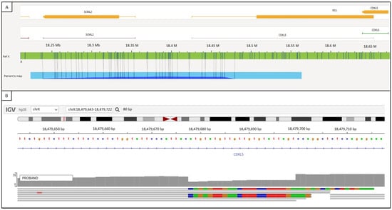 OGM software (Bionano Access v1.6) was unable to define the chromosomal structural rearrangement. However, when zooming in on the CDKL5 region, anomalous maps were noted, showing the presence of aberrant molecules only matching the reference in the first gene portion (5’ regulatory sequence, exon 1, and part of intron 1) of CDKL5. The remaining part of the patient’s physical map presented no specific labels, hampering the software’s capacity to recognize the rearrangement (Figure 4A). Unsurprisingly, the distal breakpoint of the inversion was located in the pericentromeric region of the X chromosome long arm, where high chromatin condensation does not allow the enzyme to associate the fluorochrome to its specific DNA sequence target.
